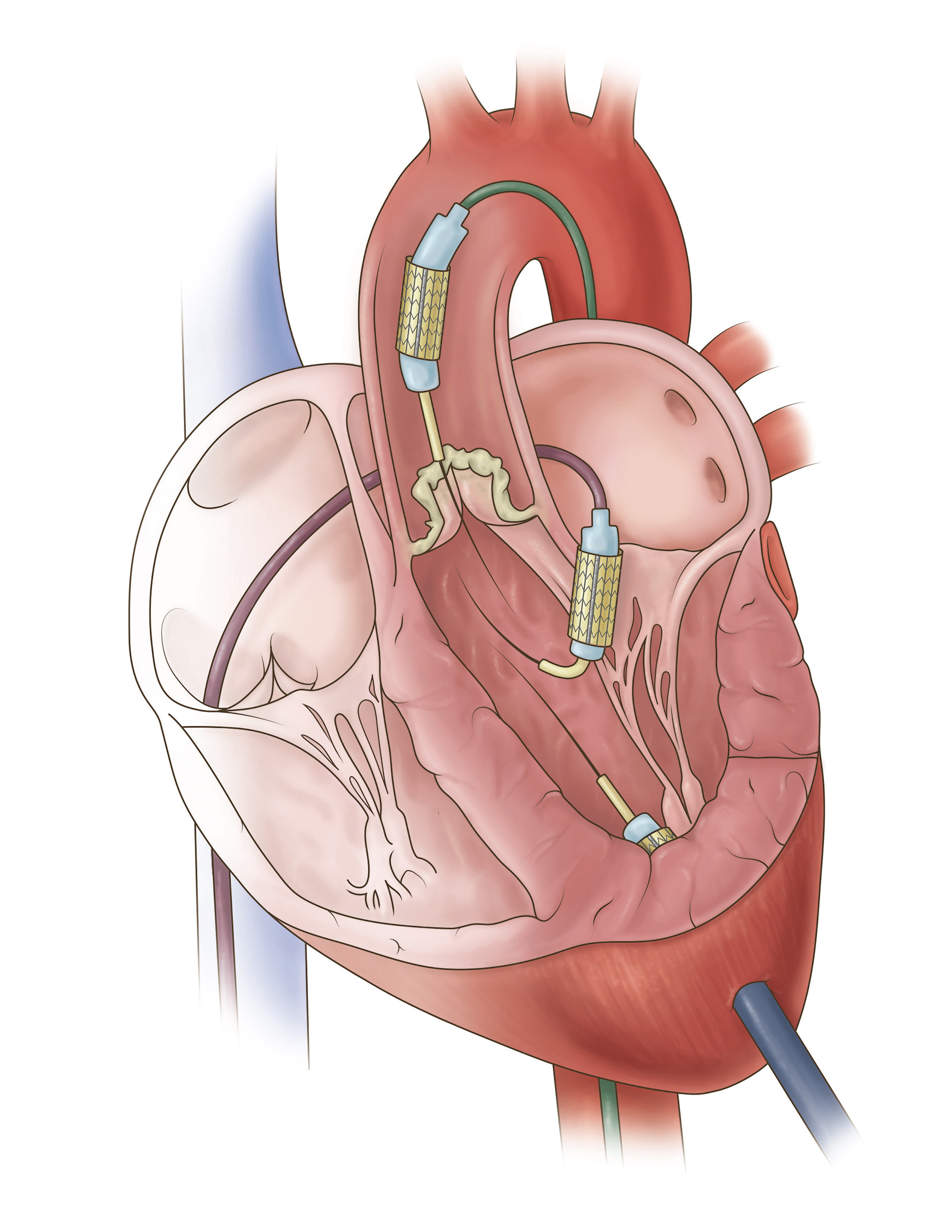 Coronal section of the heart showing various methods for noninvasive aortic valve replacement